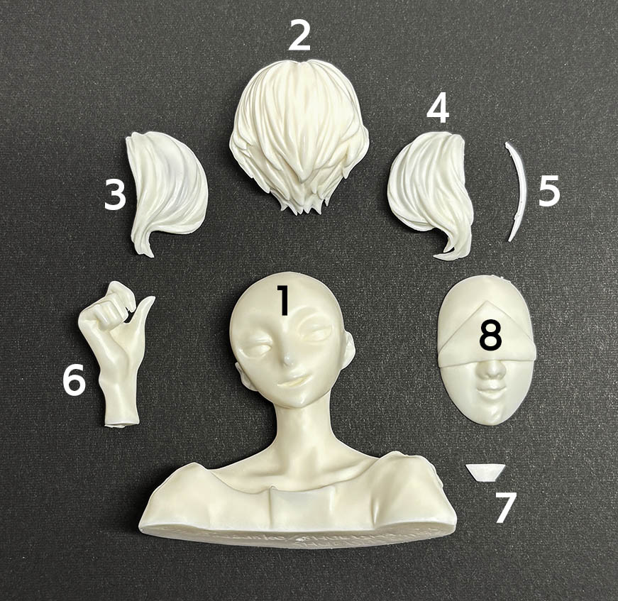 01.本体 02.後頭部 03.前髪(右) 04.前髪(左) 05.前髪(1本) 06.右手 07.ペンダント 08.お面 [付属品] 09.カード用プラ板 10.0.3mmワイヤー 11.デカール |