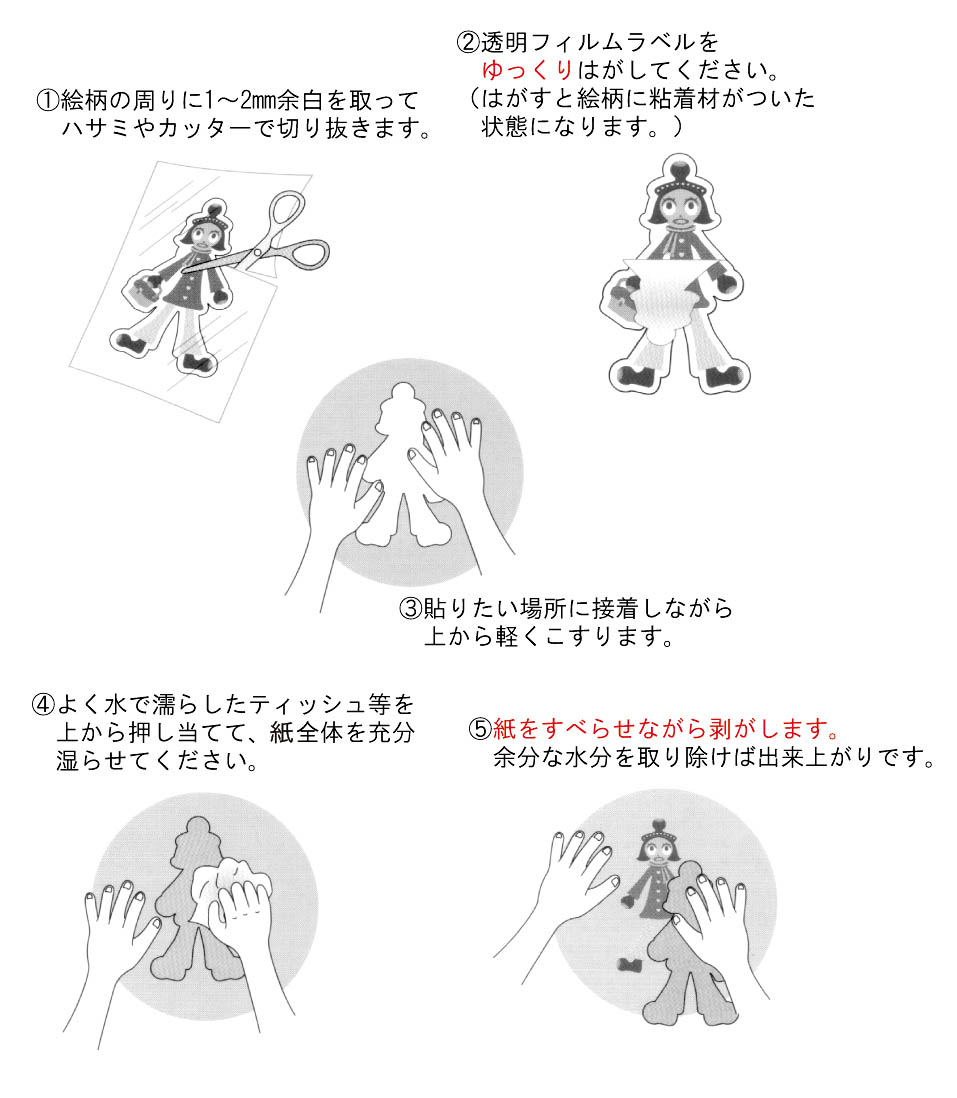 @絵柄の周りに1〜2o余白を取って、ハサミやカッターで切り抜きます。 A透明フィルムラベルをゆっくりはがしてください。 (はがすと絵柄に粘着剤がついた状態になります。) B貼りたい場所に接着しながら上から軽くこすります。 Cよく水で濡らしたティッシュ等を上から押し当てて、紙全体を充分湿らせてください。 D紙をすべらせなから剥がします。余分な水分を取り除けば出来上がりです。 |