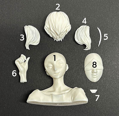 01.本体 02.後頭部 03.前髪(右) 04.前髪(左) 05.前髪(1本) 06.右手 07.ペンダント 08.お面 [付属品] 09.カード用プラ板 10.0.3mmワイヤー 11.デカール |